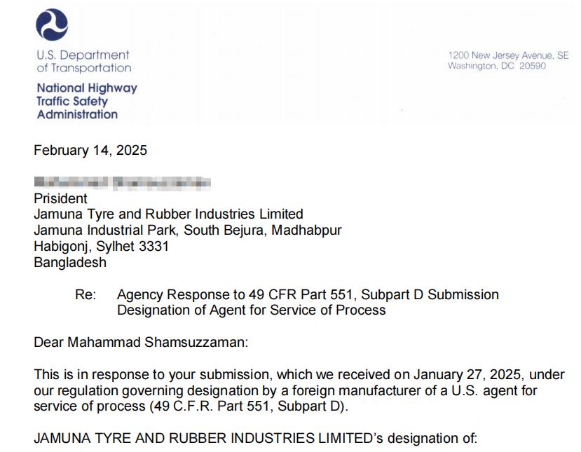 近日,我司协助Jamuna Tyre and Rubber Industries Limited完成了DOT申请。