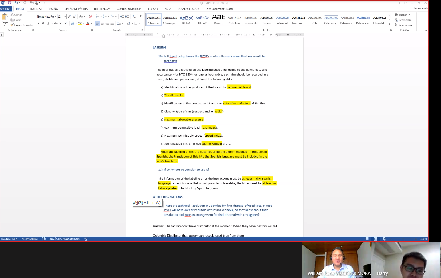 近日,我司为国内某工厂,完成了哥伦比亚的远程视频审核。 按照哥伦比亚MinCIT认证的一般要求,提交申请后的3周,将安排审核员对工厂进行审核,并抽取样品送至国内实验室测试,测试完成并出具测试报告后的3-4周,将批复MinCIT证书。因疫情原因,实际工厂审核改为在线视频审核,样品测试改为直接送样至实验室。本次工作,我司与哥伦比亚审核员Mr. William Rene提前进行了沟通,协助工厂准备了全套资料,顺利完成审核,预计证书本月内签发。