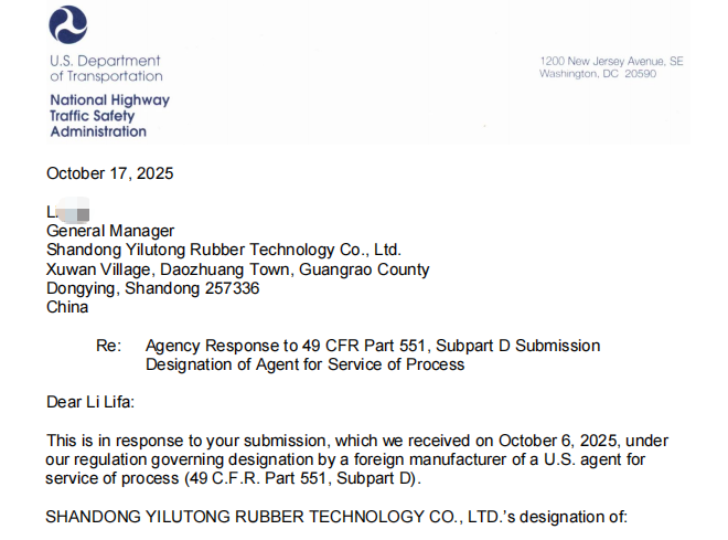 近日,我司协助山东宜路通橡胶科技有限公司完成了DOT申请。